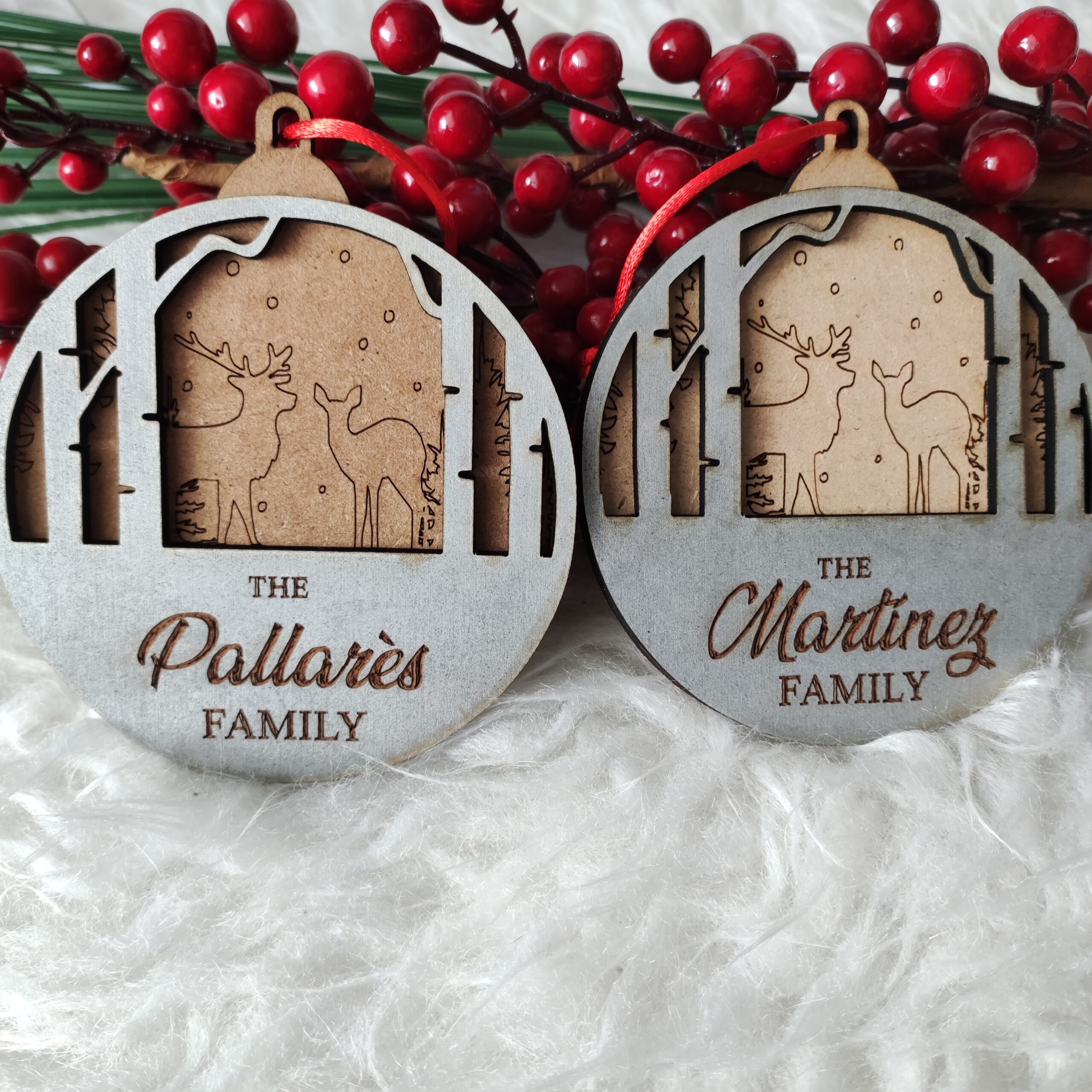 Bola Navidad Familia Renos de madera. Dimensiones 10cm x 12cm.