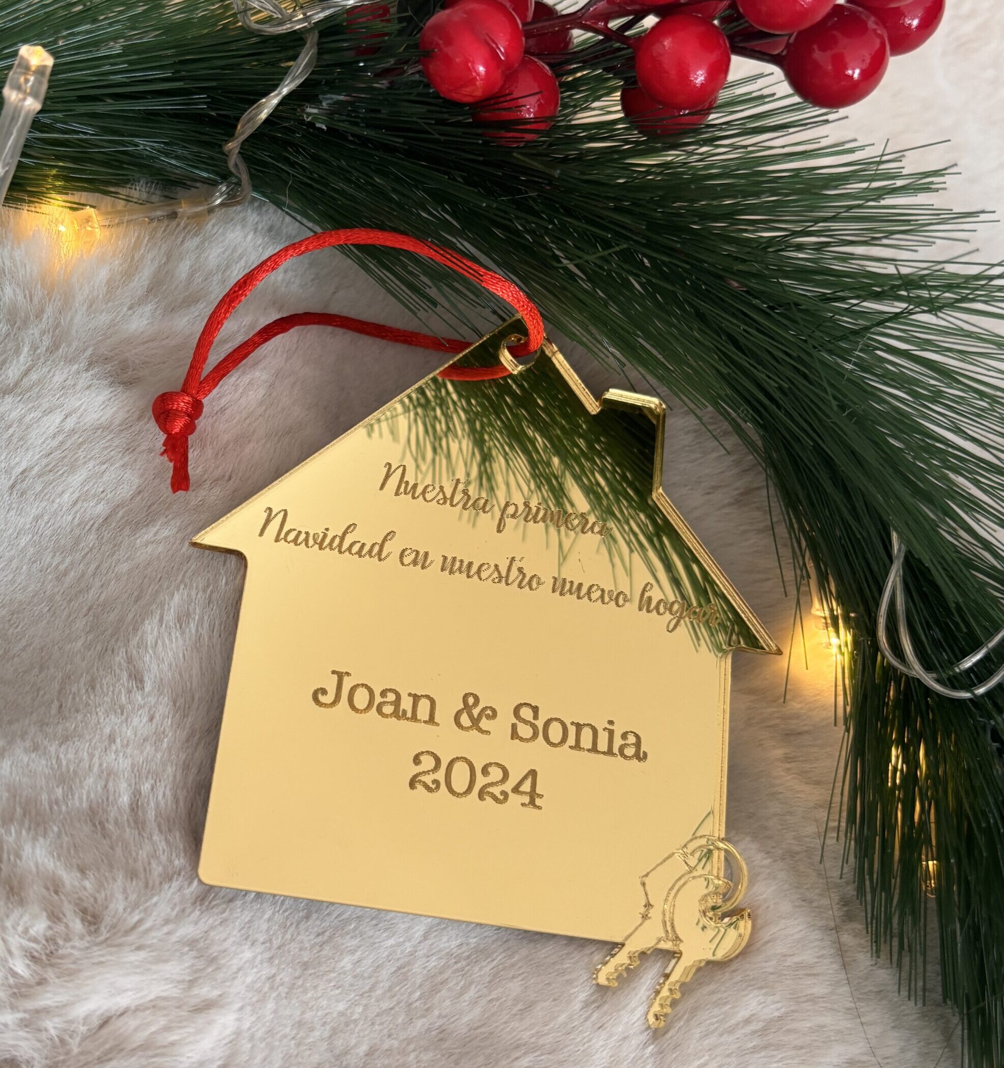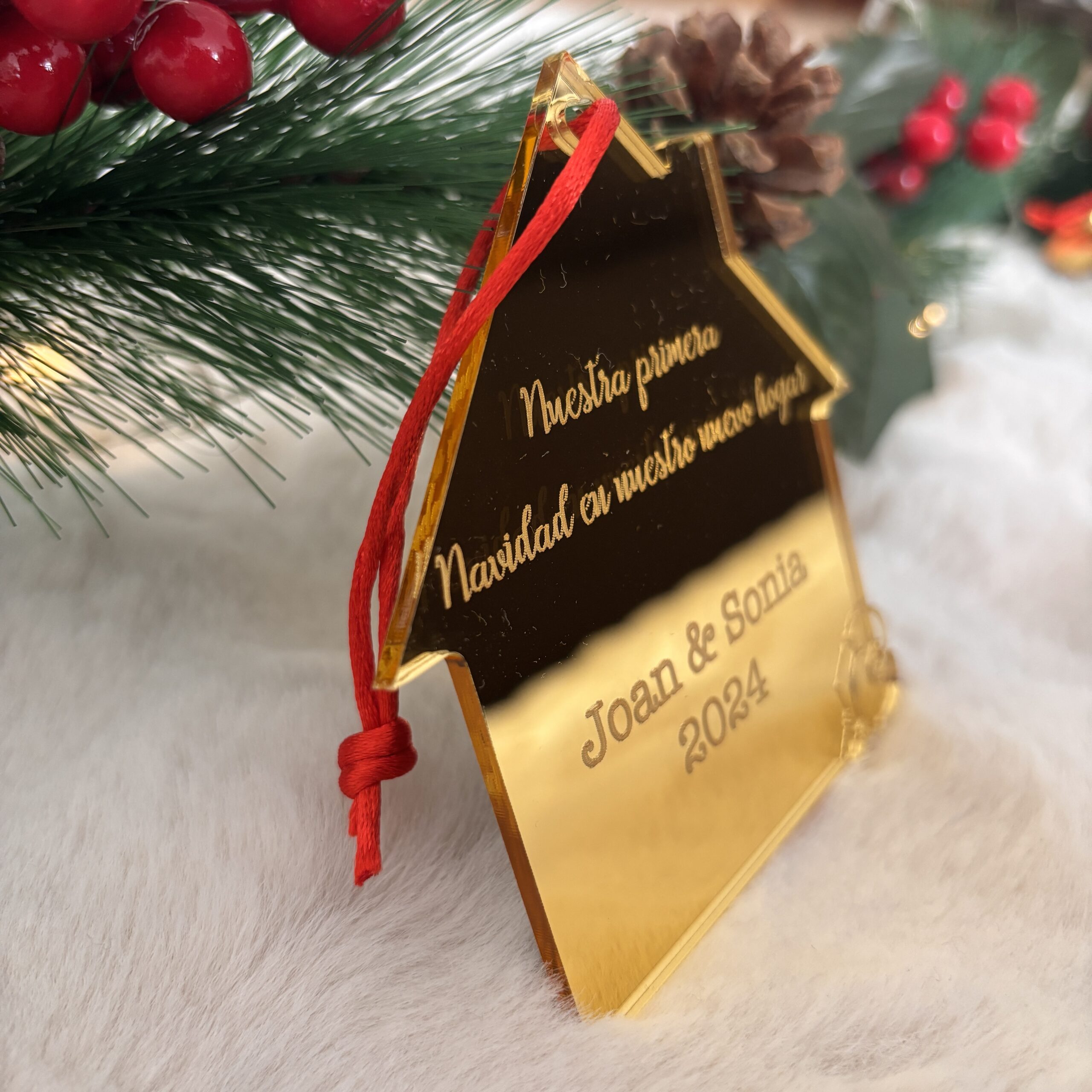 Celebra la magia de tu primera Navidad en el nuevo hogar con un adorno único y personalizado. Nuestra bola de Navidad con forma de casa, fabricada en metacrilato de alta calidad con acabado en plata o oro efecto espejo, es el detalle perfecto para conmemorar este momento tan especial. Personalízala con el nombre de tu familia y el año de esta primera Navidad, creando un recuerdo eterno que reflejará la calidez y alegría de tu nuevo hogar. Haz que tu árbol brille con estilo y nostalgia, y guarda para siempre este simbolismo de nuevos comienzos y momentos compartidos. ¡Haz de esta Navidad un recuerdo imborrable!