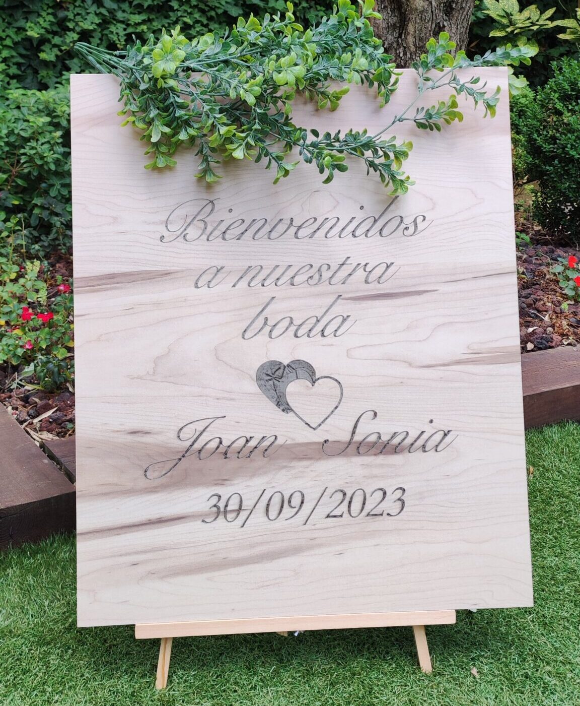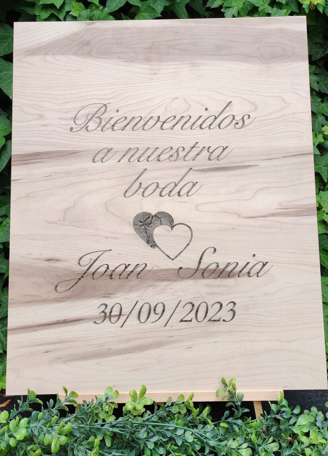 Cartel de madera de “Bienvenidos a nuestra boda” personalizado con vuestros nombres y fecha grabados. Dimensiones 49cm x 60cm x 1,6cm de grosor.