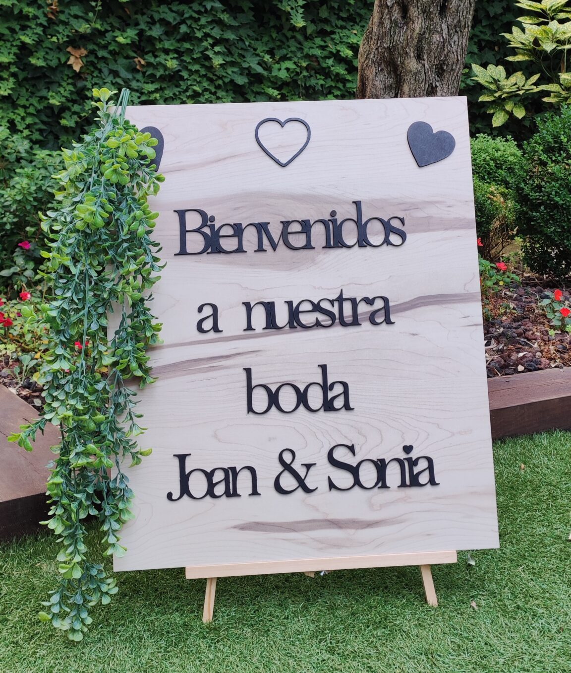 Cartel de madera de «Bienvenidos a nuestra boda» personalizado con vuestros nombres en relieve. Dimensiones 49cm x 60cm x 1,6cm de grosor.