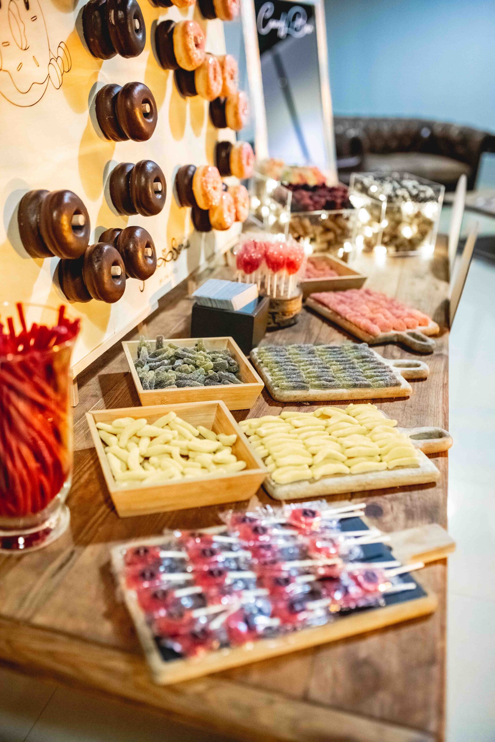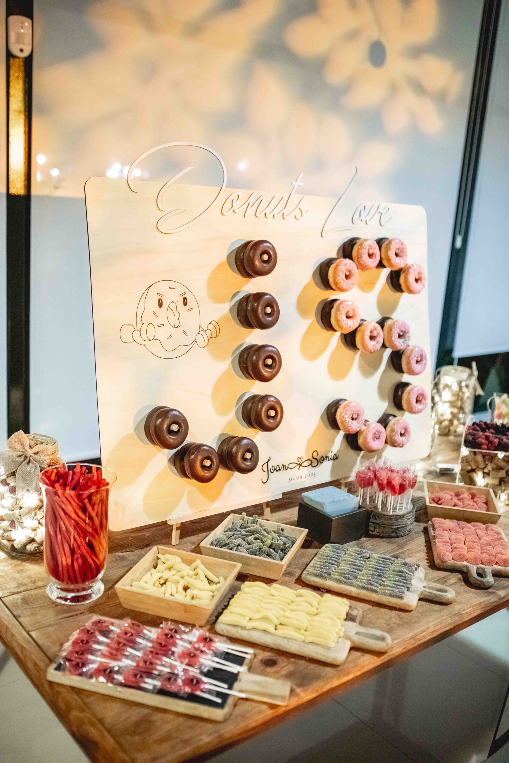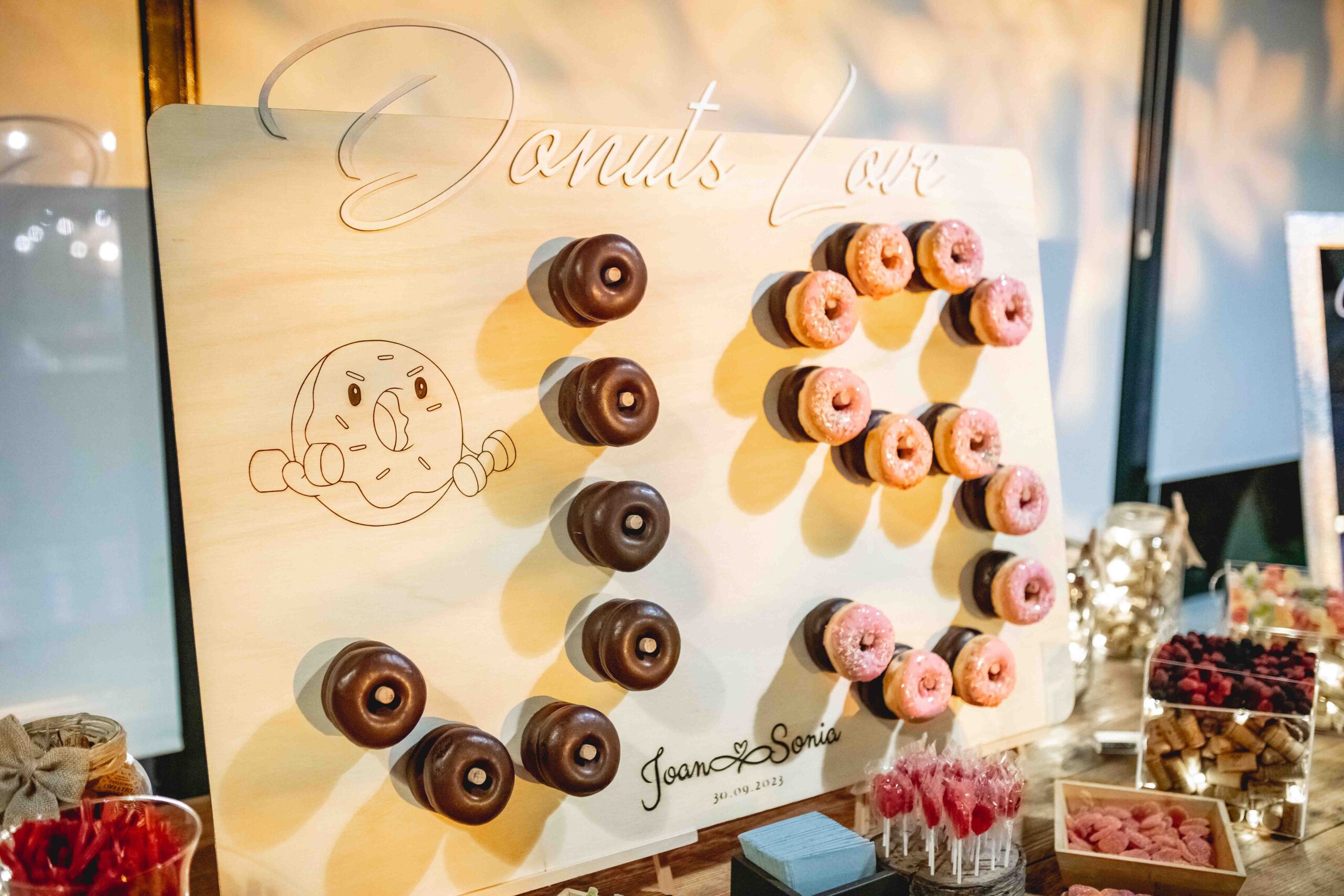 Este cartel no solo es una pieza única de decoración, sino que también le da un toque personal y sabroso a vuestro gran día. Cada vez que veáis esas iniciales formadas por donuts frescos y glaseados, recordaréis el amor y la dulzura de vuestra unión.