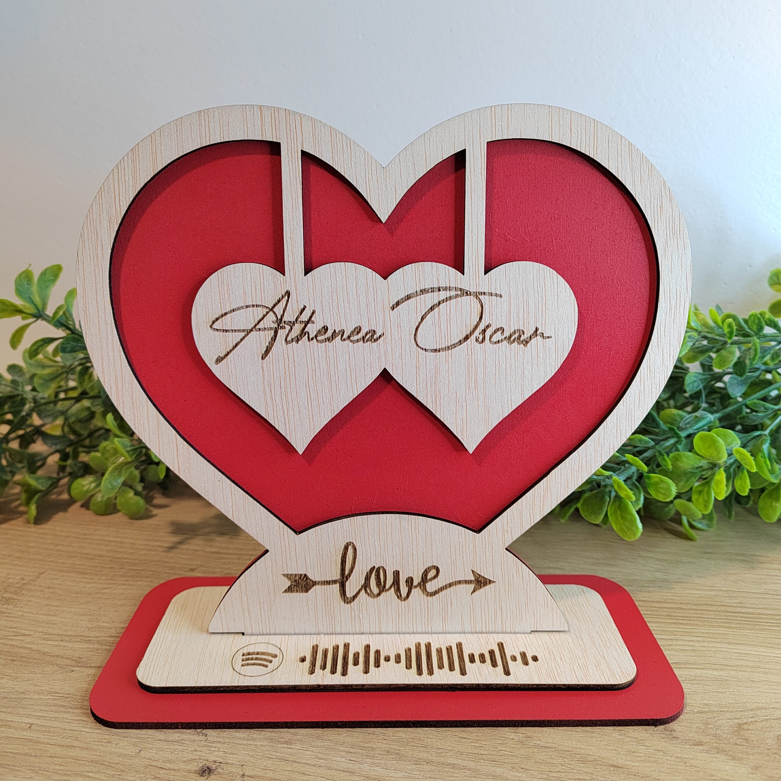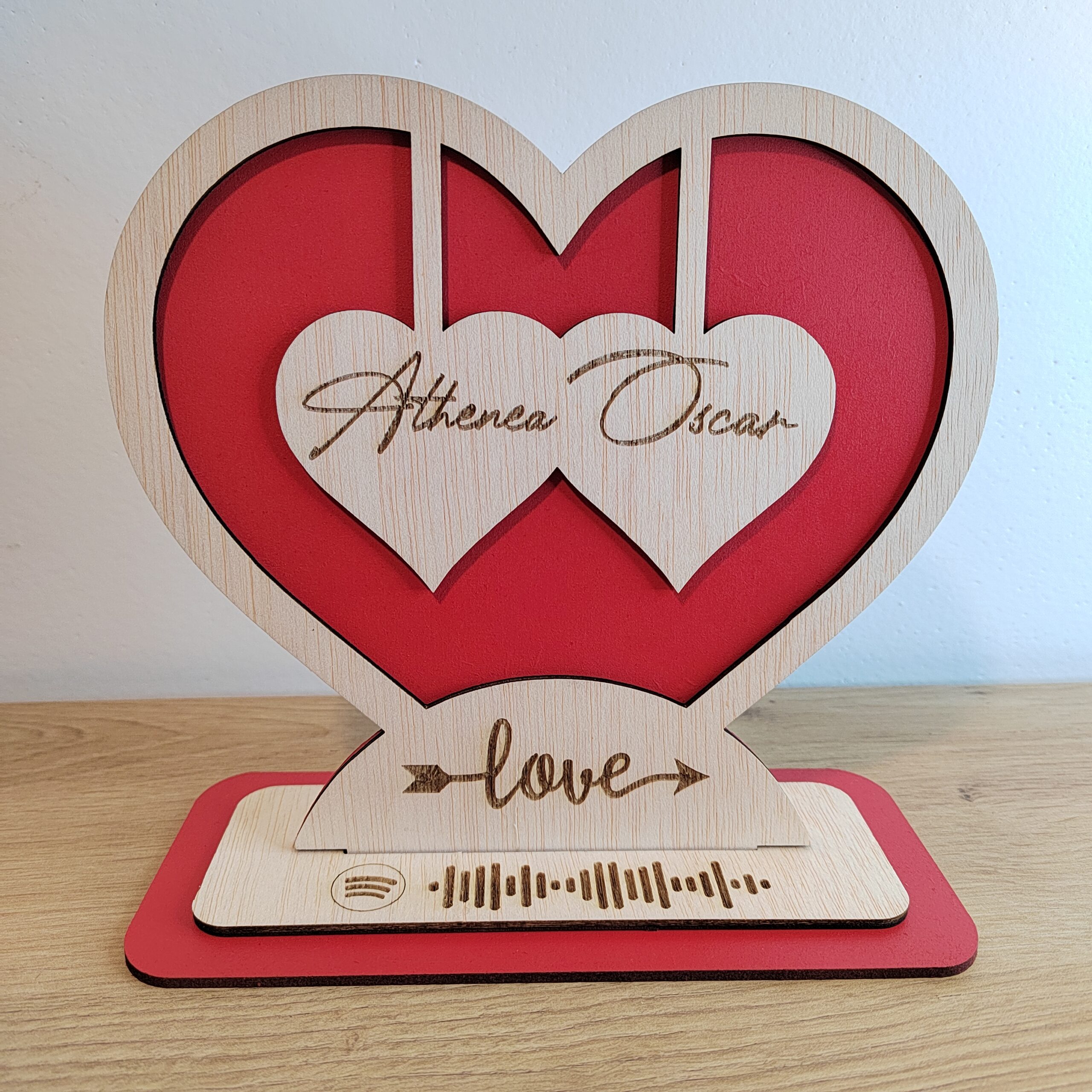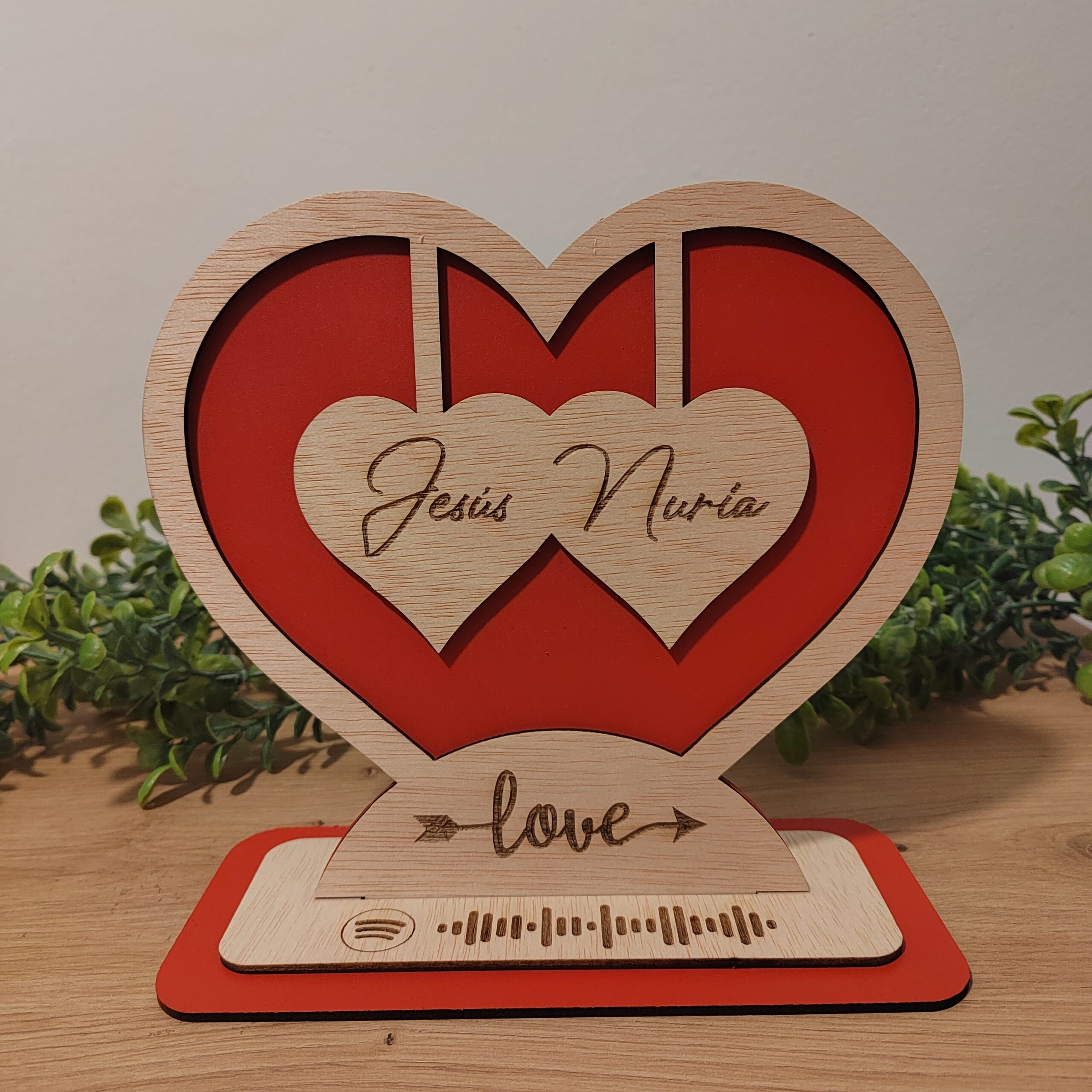 ¡Sorprende a esa persona especial con el Corazón Love de madera personalizado con vuestros nombres y una canción de Spotify dedicada! Este corazón de madera es el regalo perfecto para demostrar tu amor y cariño.