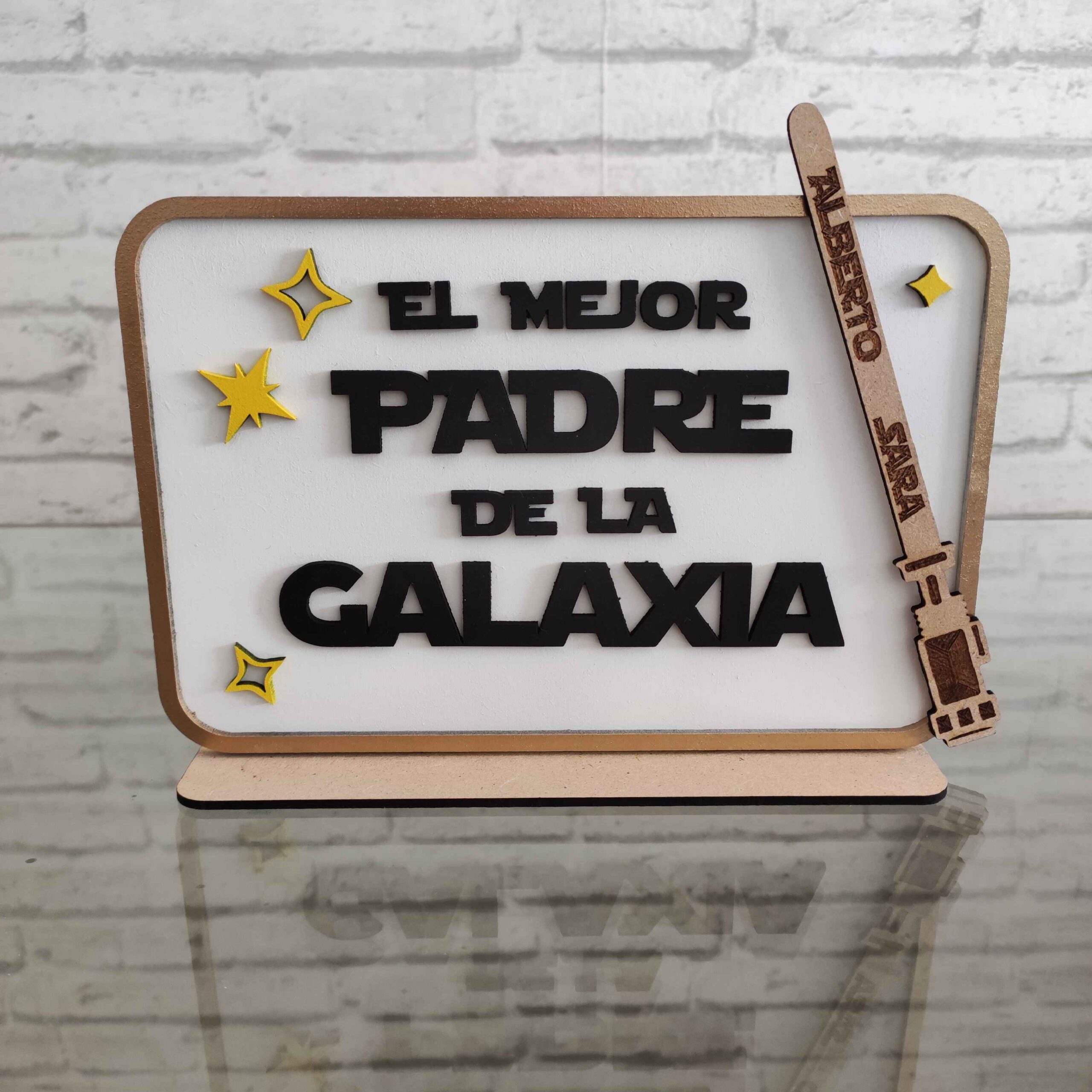 Sorprende a tu padre en su día especial con nuestro letrero decorativo «El Mejor Padre de la Galaxia» hecho de madera y espadas láser. Será un regalo que siempre recordará. Dimensiones 22cm x 15cm.