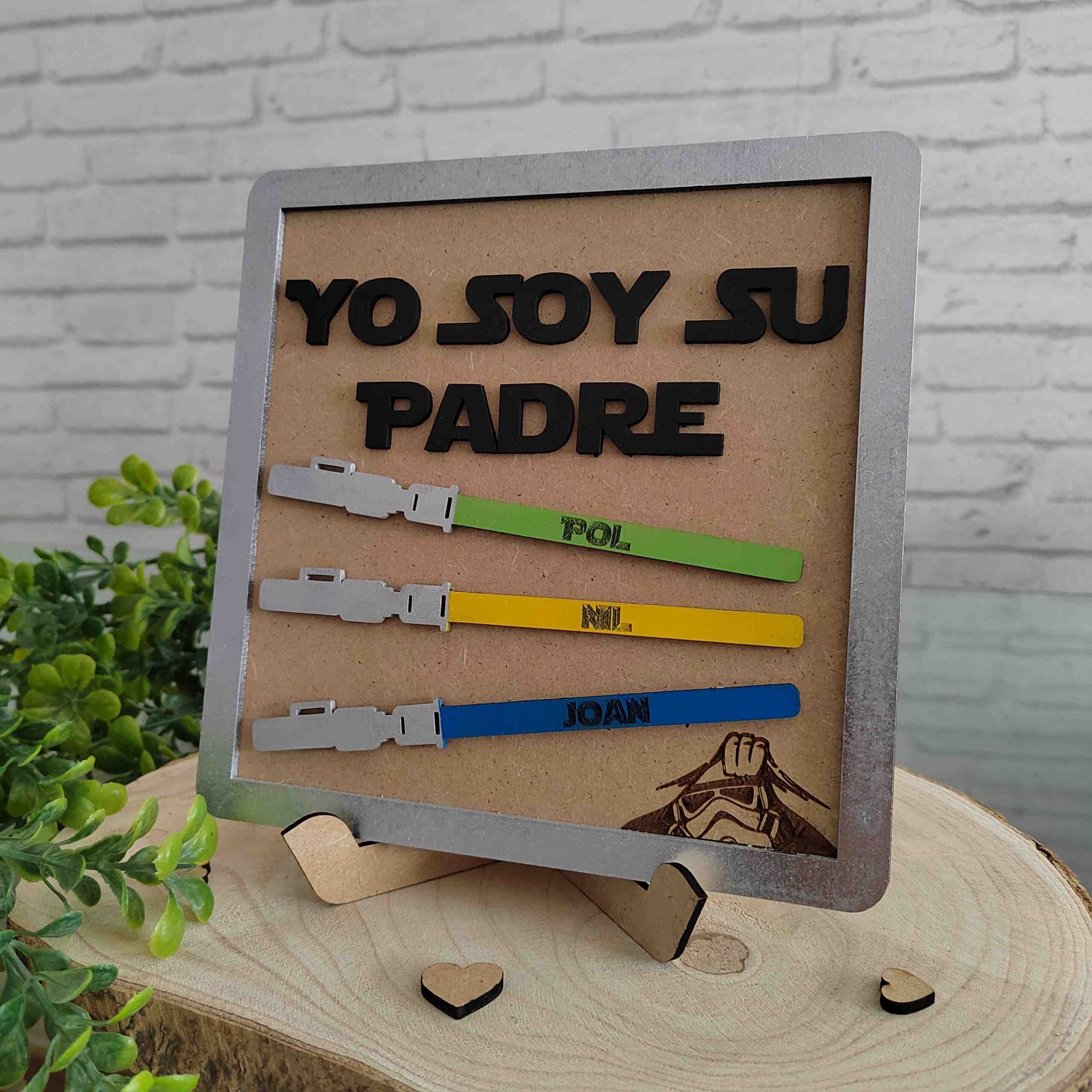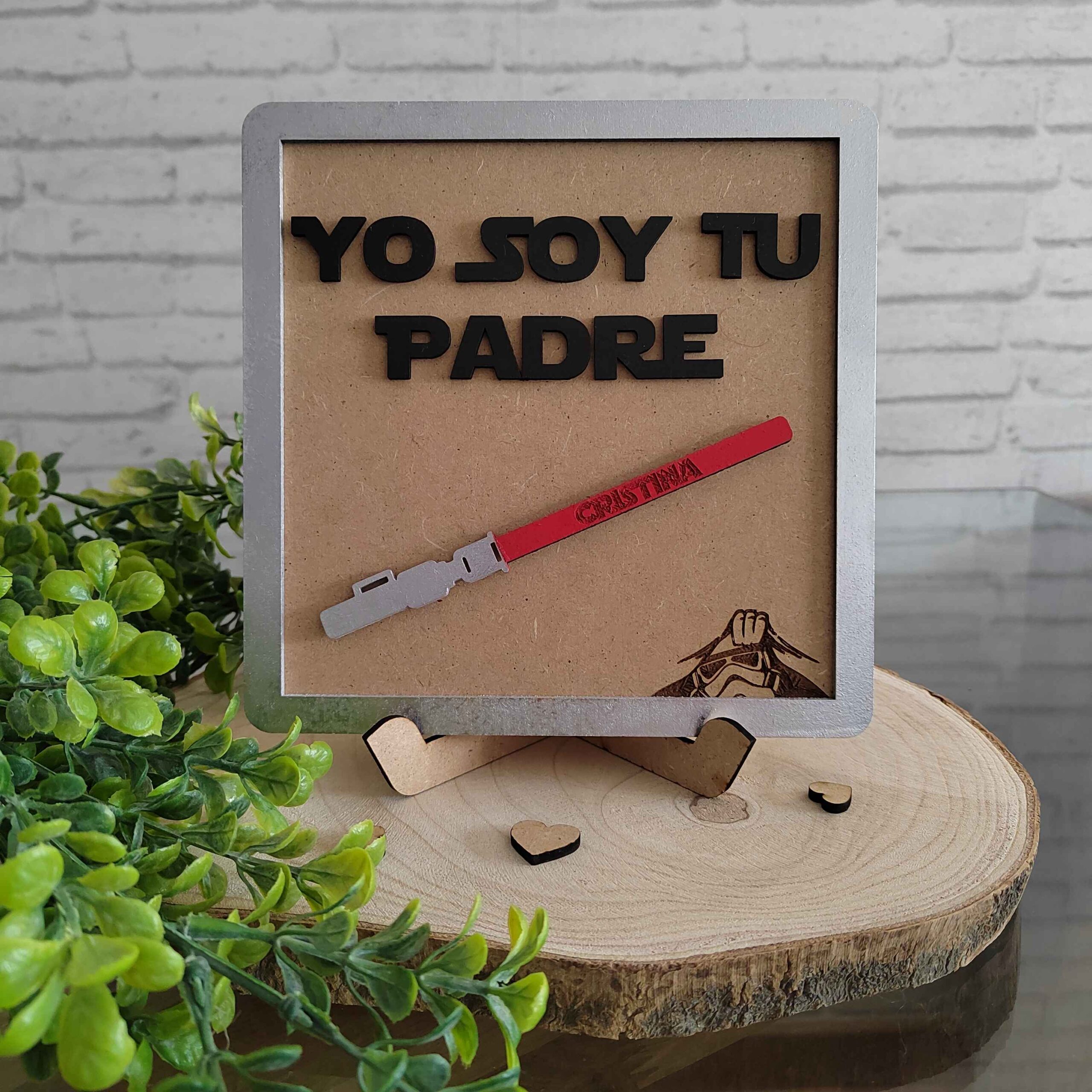 Este marco de «Yo soy tu padre» de madera y espadas láser es el regalo perfecto para cualquier padre que quiera exhibir su amor por su familia. ¡Haz que el Día del Padre sea inolvidable con este regalo único y especial! Dimensiones 19x19cm más el soporte.