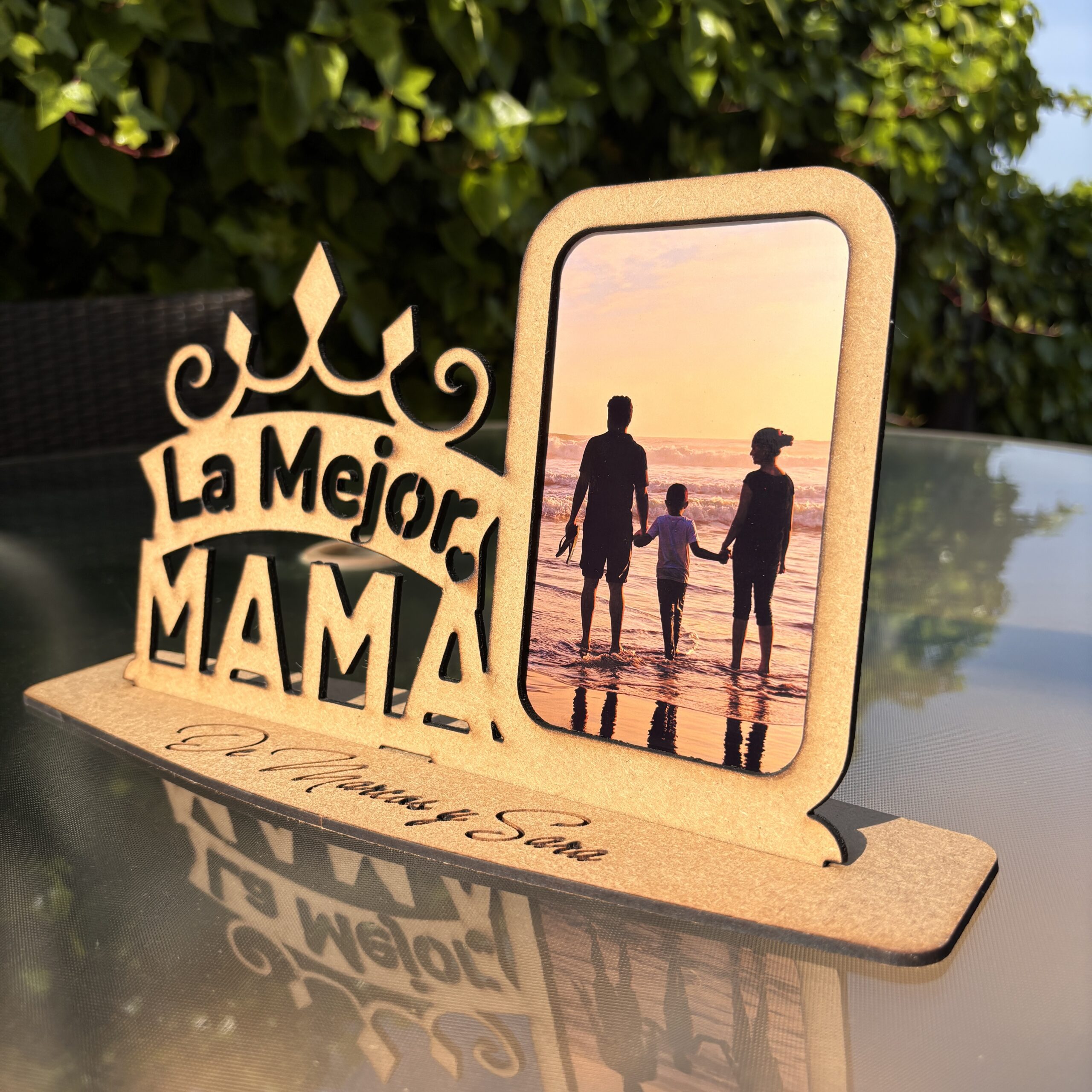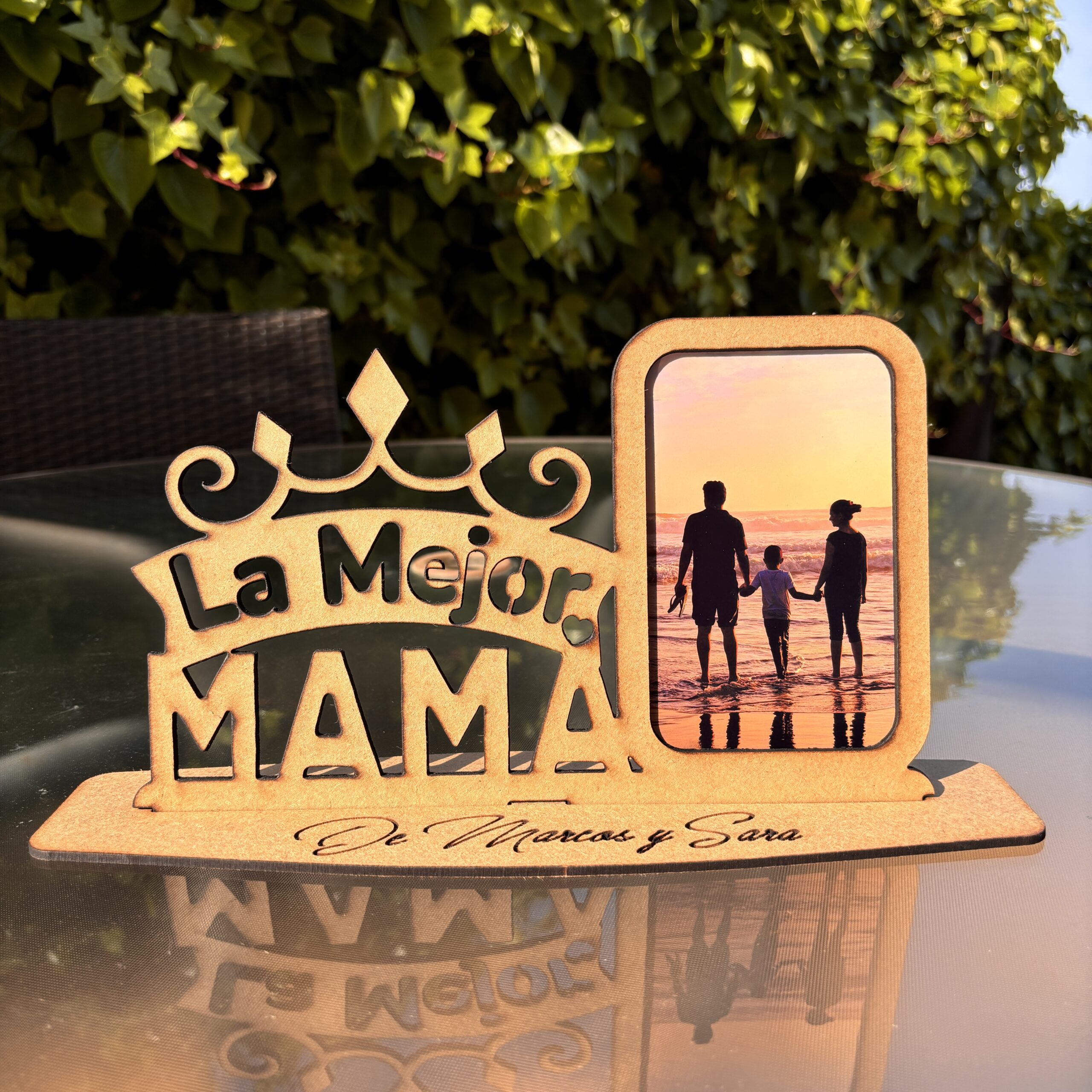 Nuestro marco de fotos personalizado es la elección perfecta para expresar tu cariño hacia mamá. Fabricado en madera de alta calidad o en elegante metacrilato efecto espejo, este marco es un verdadero tesoro sentimental.