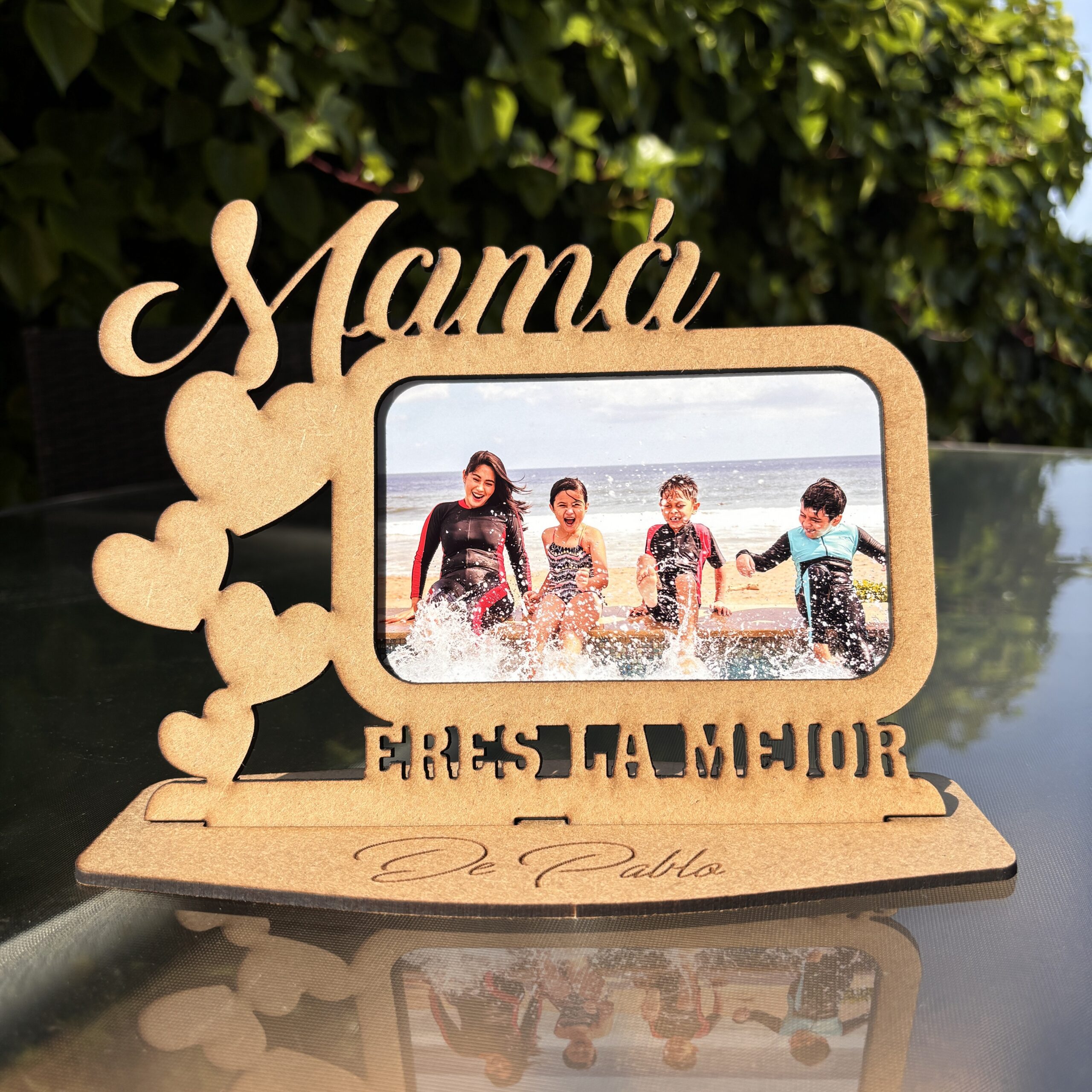 Nuestro marco de fotos personalizado es la elección perfecta para expresar tu cariño hacia mamá. Fabricado en madera de alta calidad o en elegante metacrilato efecto espejo, este marco es un verdadero tesoro sentimental.