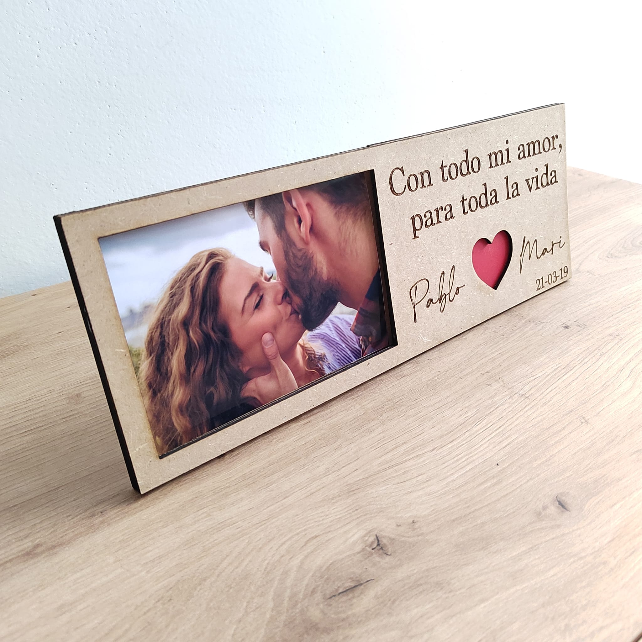 Dale vida a tus fotos con nuestros marcos de fotos personalizados de madera. Hechos a mano con madera de alta calidad, cada marco está grabado con el nombre o el diseño de tu elección, convirtiéndolo en un regalo único y especial para amigos y familiares. Además, son duraderos y ligeros. Con nuestros marcos de fotos personalizados de madera, podrás mostrar tus recuerdos más queridos de una manera especial. Haz tu pedido hoy y personaliza el tuyo.