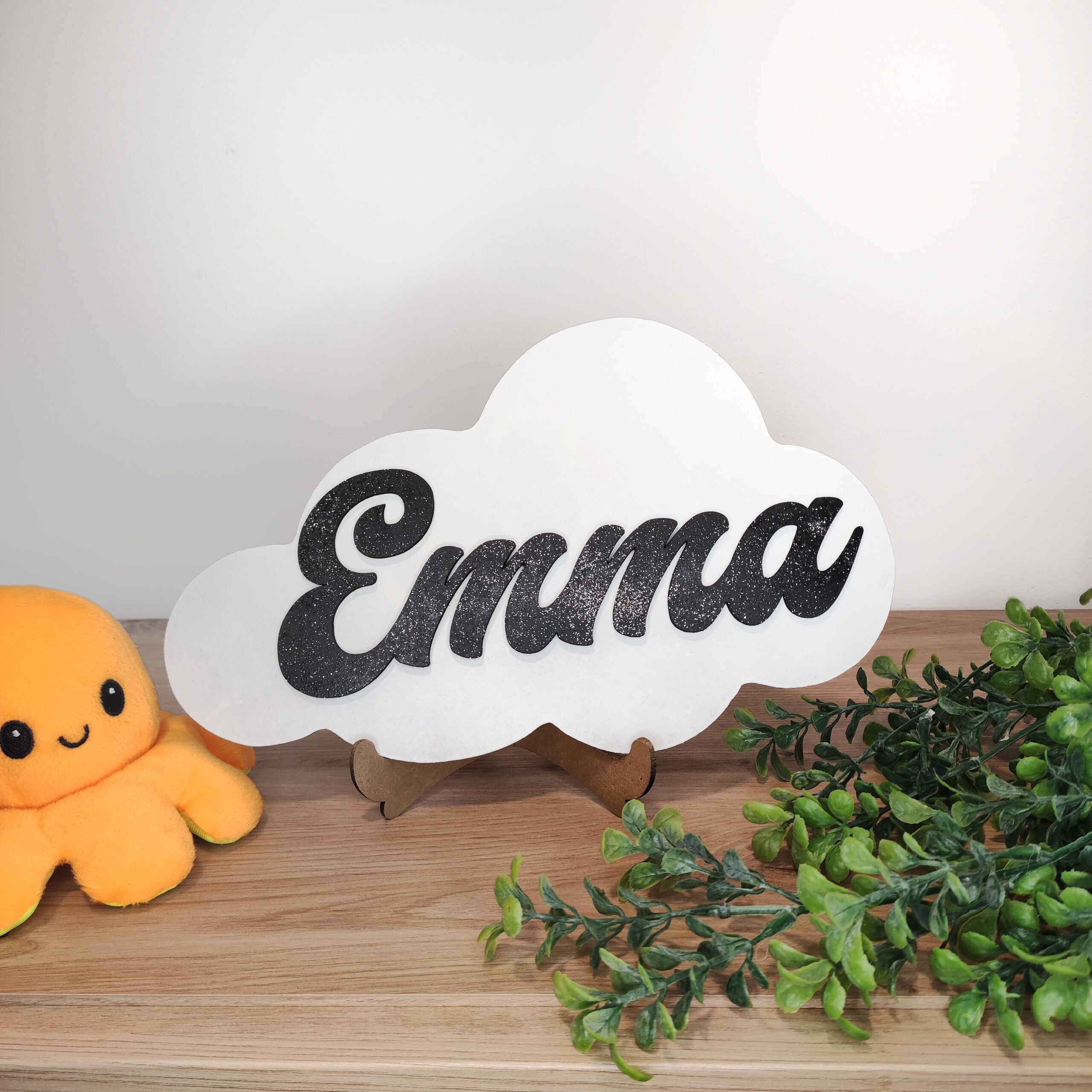 Decora cualquier estancia con esta nube de madera con nombre incorporado. Puedes colgarla en la pared o en la puerta con cinta de doble cara sin problemas.
