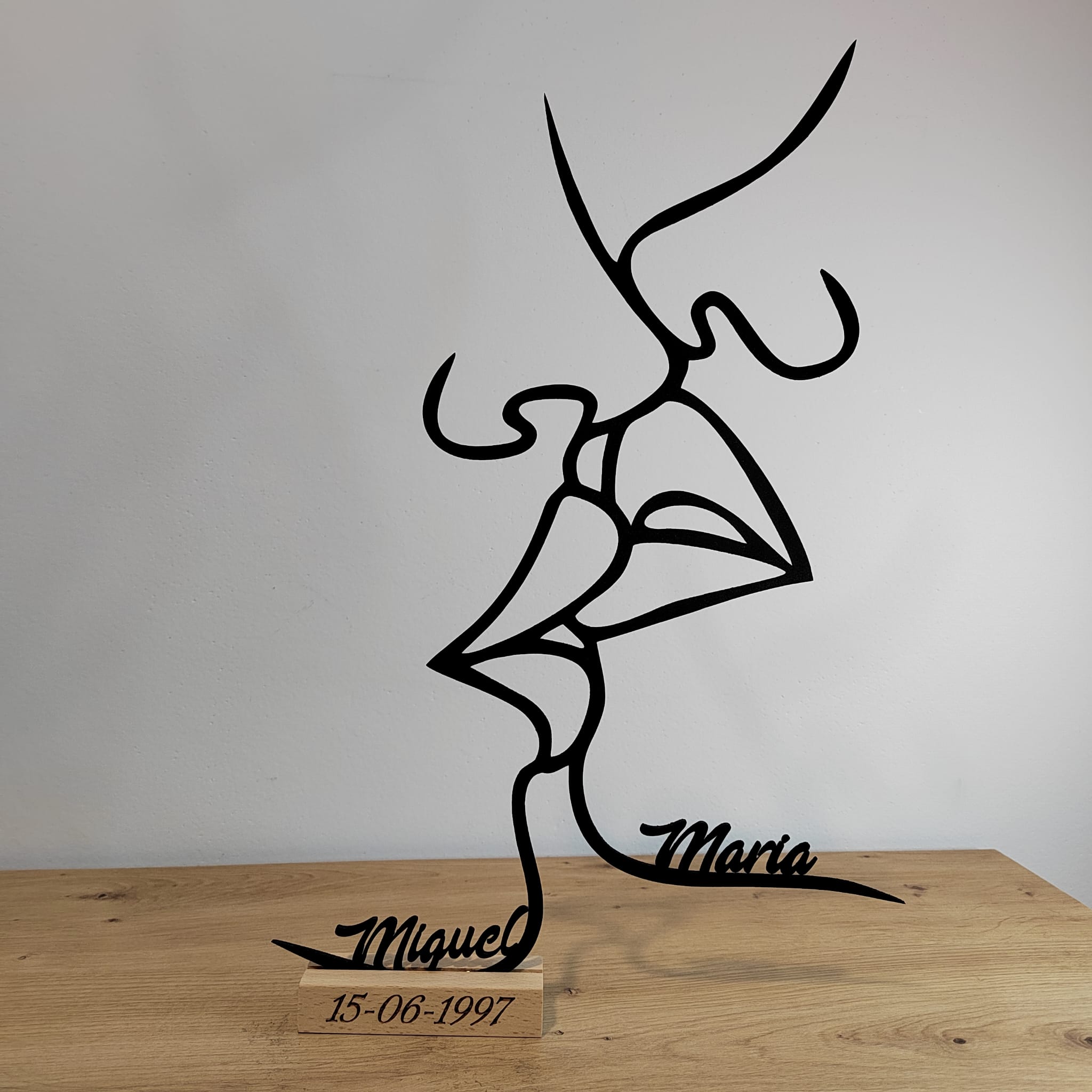 Quieres añadir un toque especial a la decoración de tu hogar o regalar un detalle único y personalizado? Nuestra silueta de beso de madera es el complemento perfecto para cualquier espacio y puede ser personalizada con los nombres de tu elección. Además, para darle un toque aún más personal, ofrecemos una base de soporte de madera con los nombres grabados o una fecha. Añade un toque romántico a tu hogar o sorprende a alguien especial con este regalo único y personalizado.