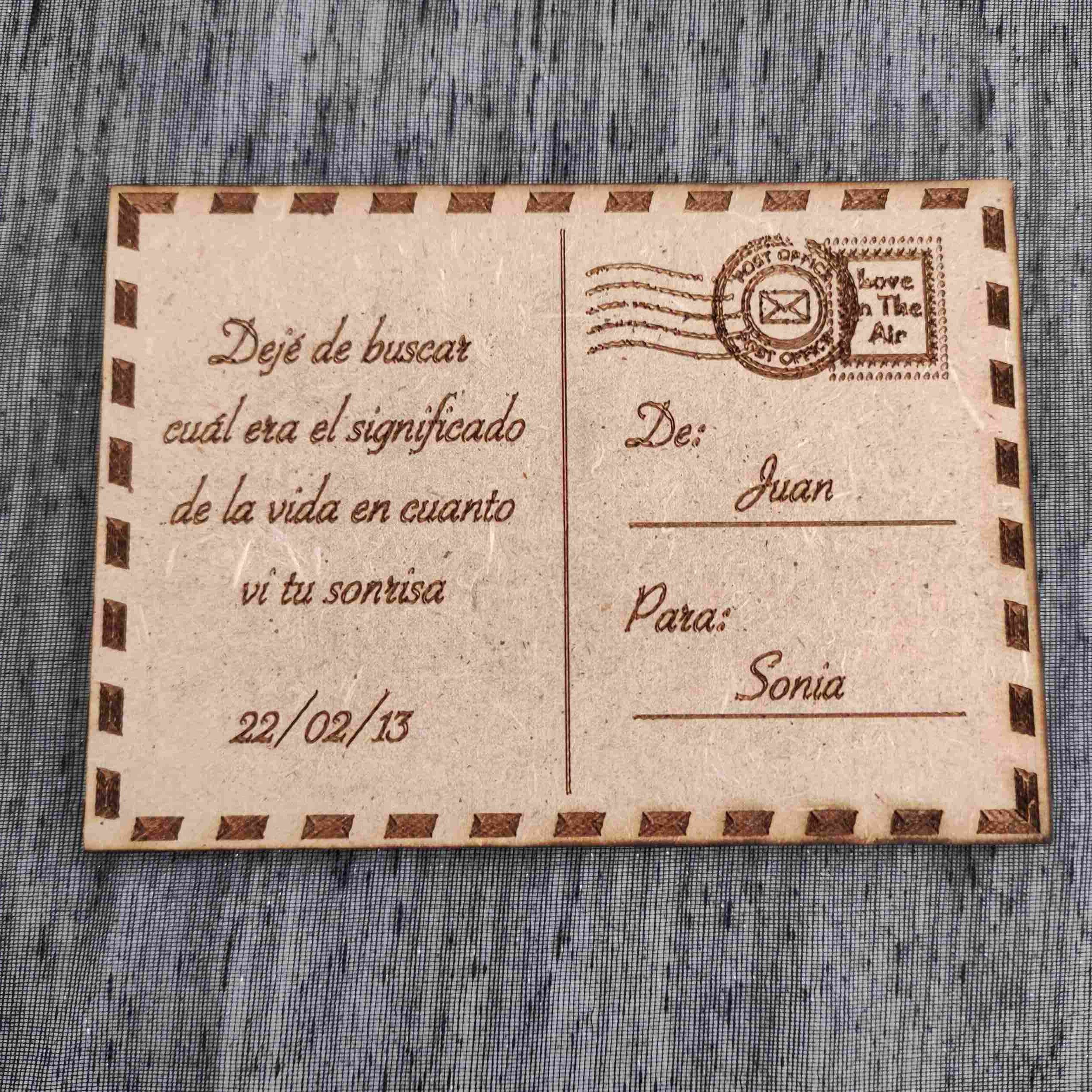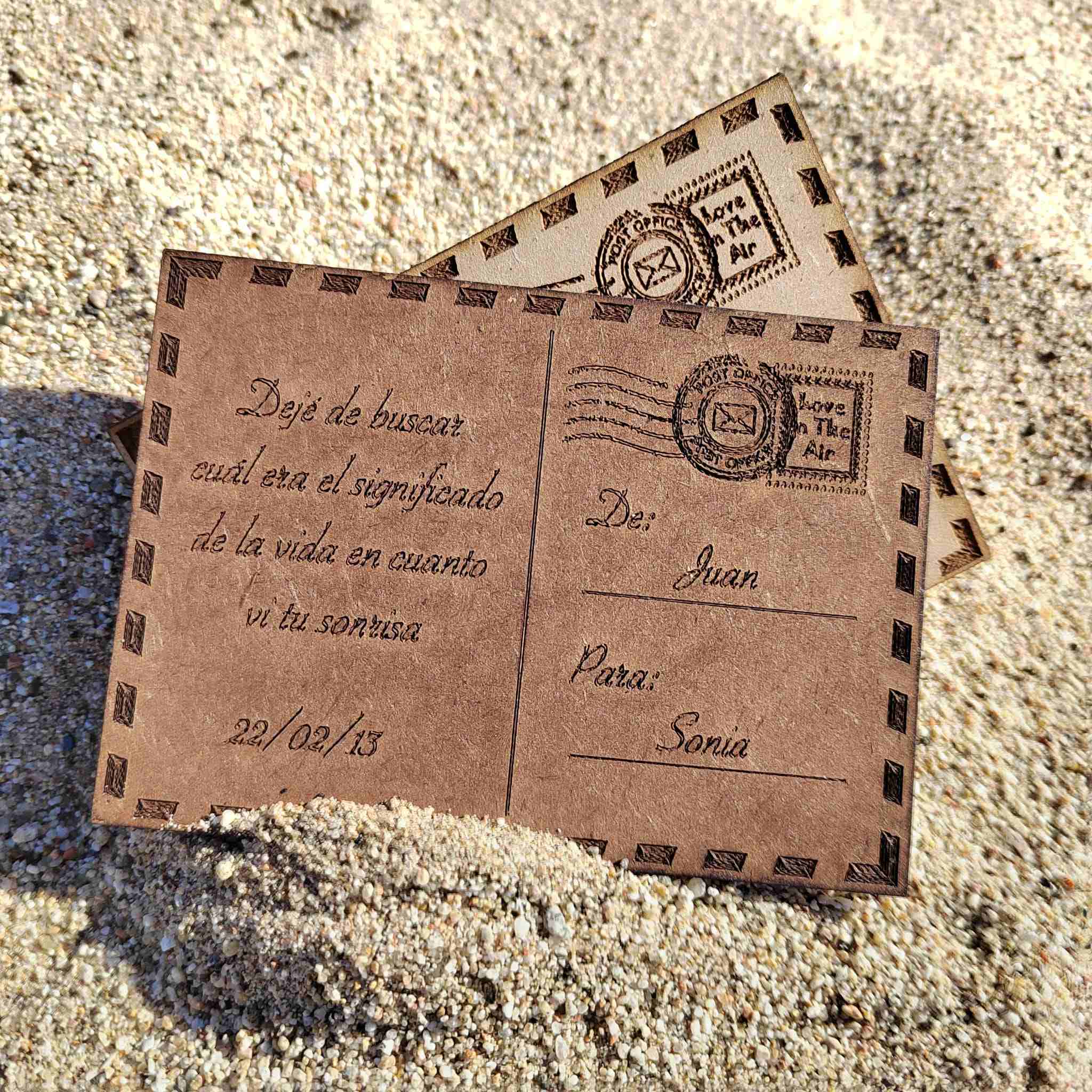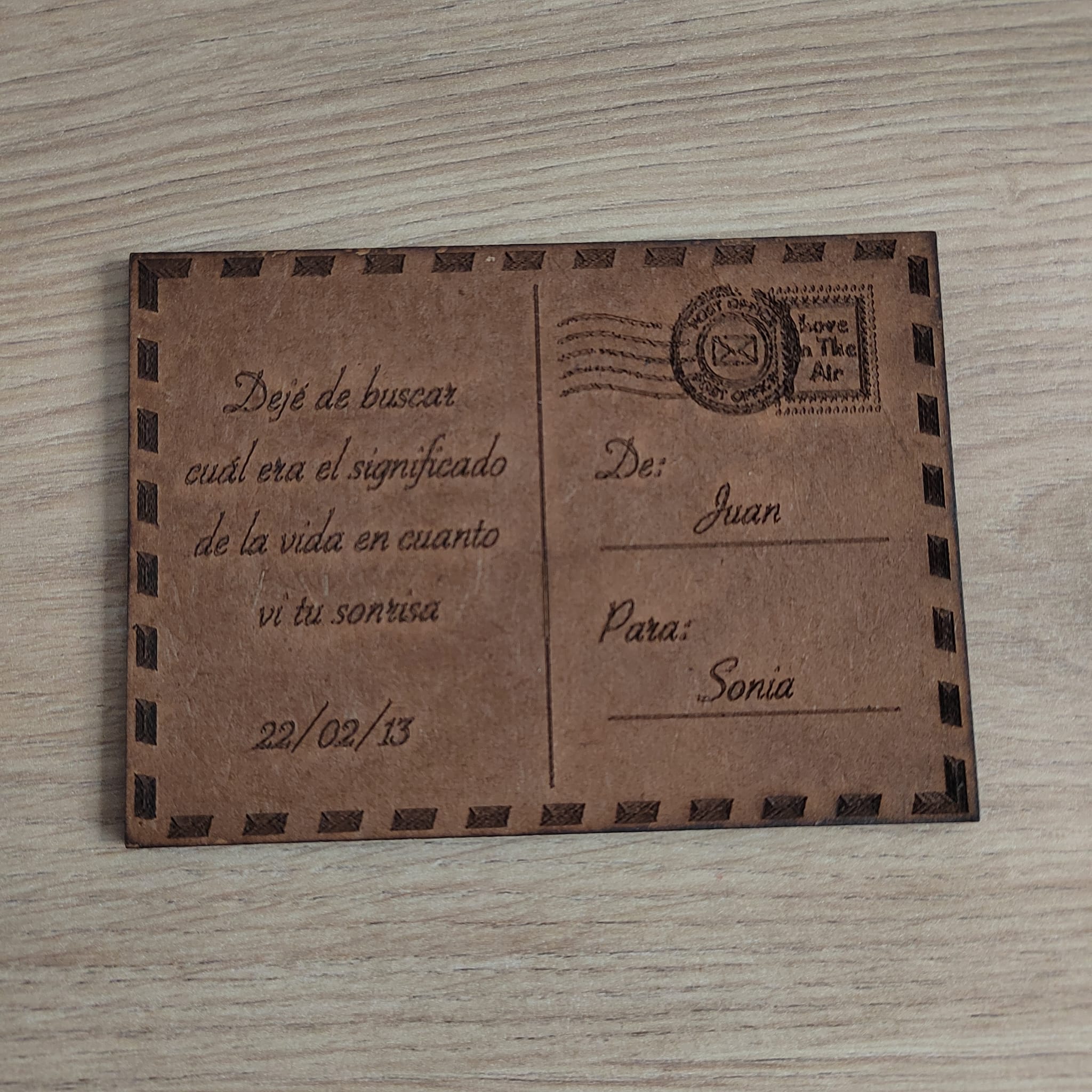 ¿Quieres regalar algo único y especial para esa persona tan importante en tu vida? Nuestra tarjeta de madera personalizada es perfecta para cualquier ocasión. Puedes incluir un mensaje personalizado, vuestros nombres y la fecha de ese momento tan especial. Con dimensiones de 11cm x 7,9cm, esta tarjeta de madera es un regalo duradero que se puede guardar como recuerdo para siempre.